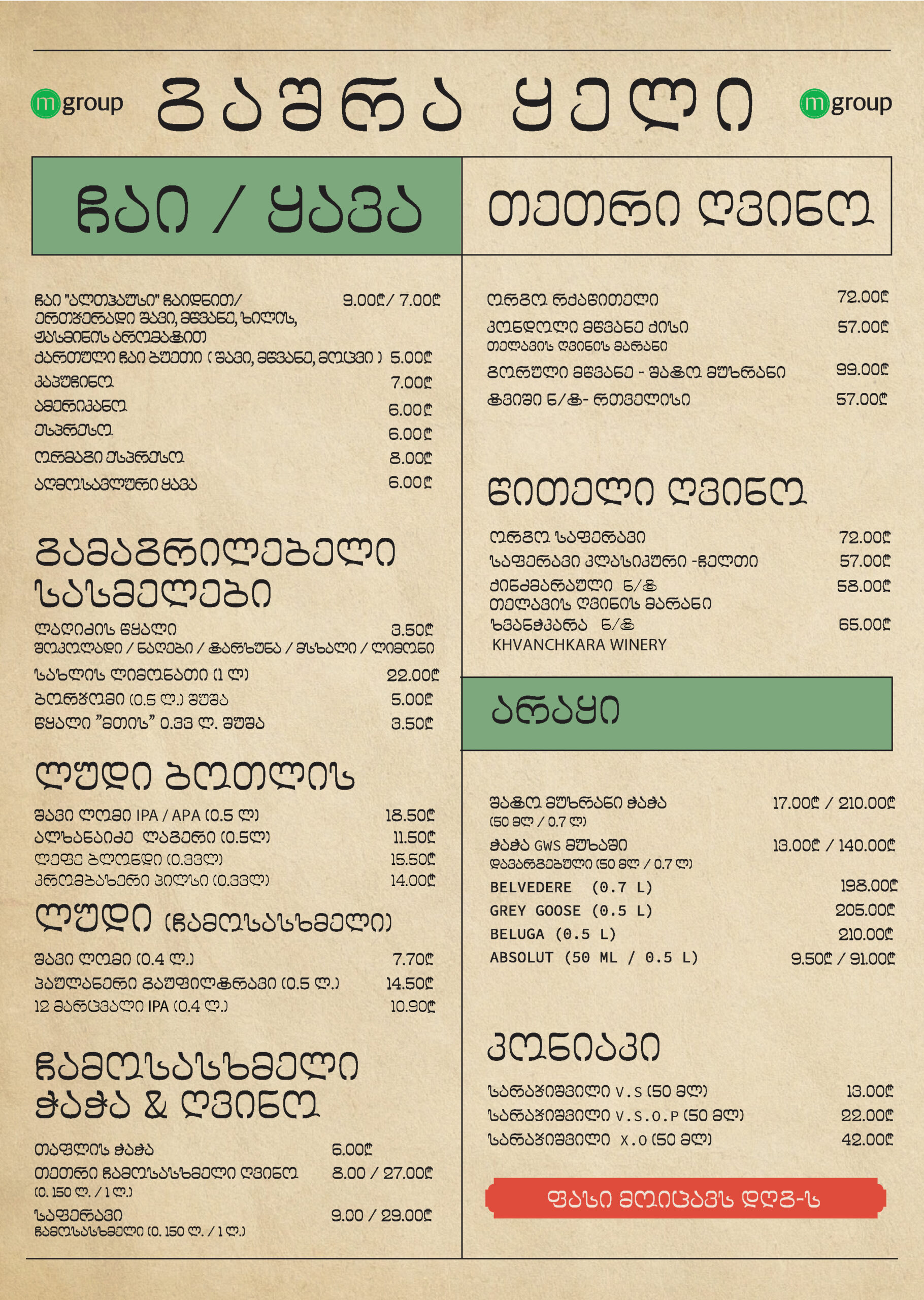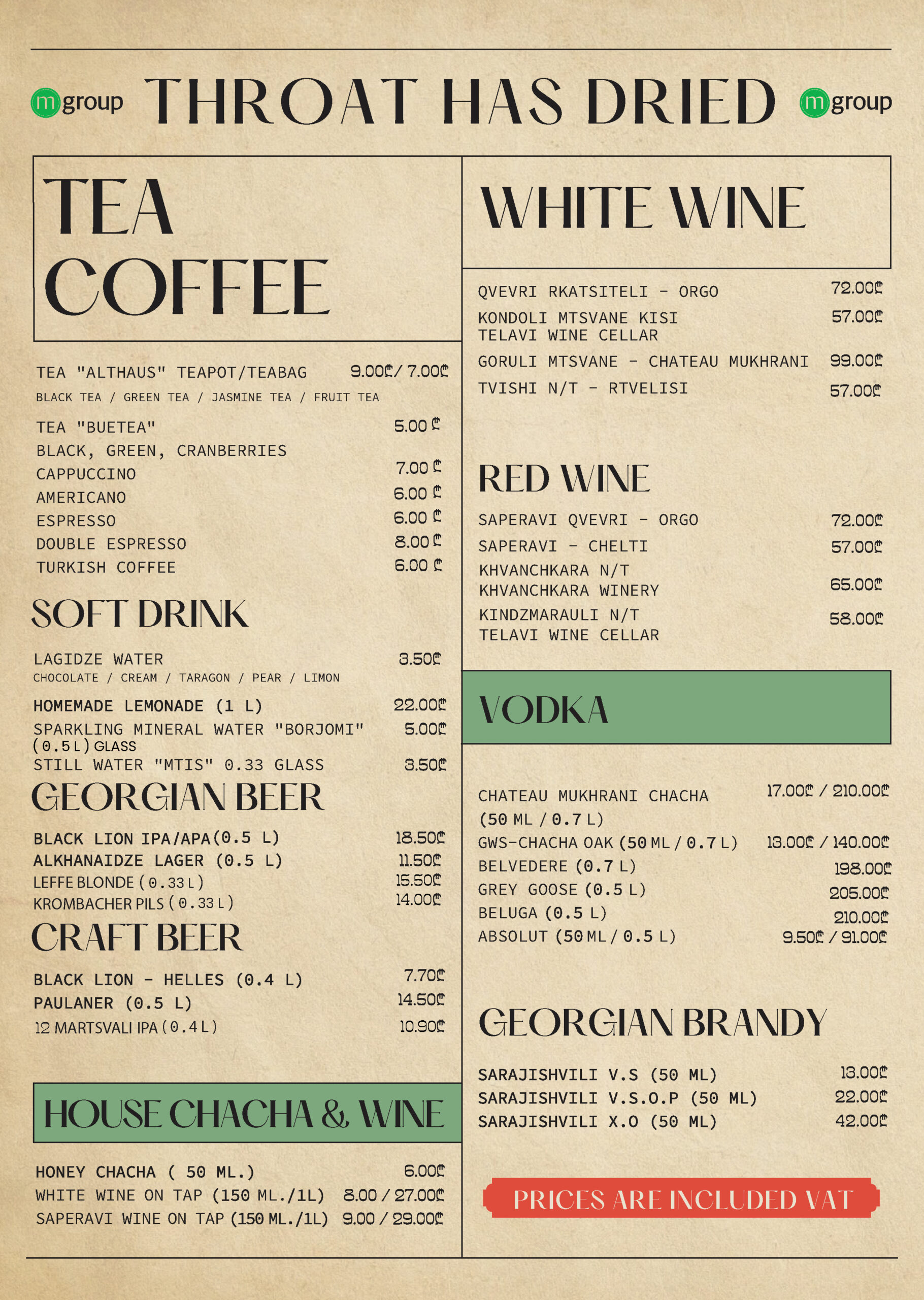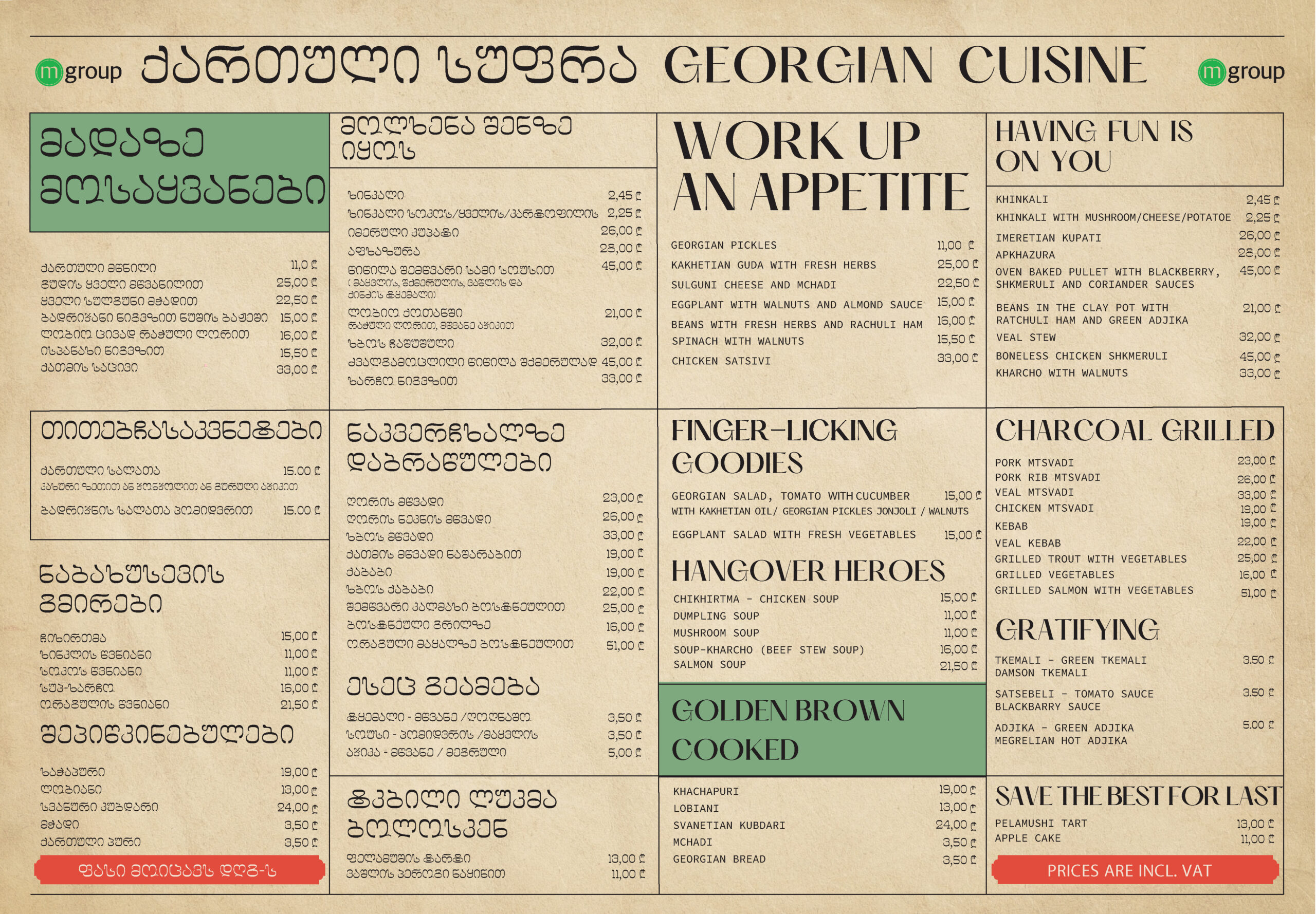 სტუმრობისას მასპინძელო ექსპრესს ხასიათს თითოეულ დეტალში იგრძნობთ. ძველებური გაზეთის ინტერპრეტაციით შექმნილია მენიუ, სადაც კერძების ჩამონათლის გარდა გვხვდება სადღეგრძელოები და ქართული სუფრის თავისებურებები.